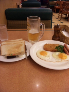 そして入店直後、生ビール中を注文。その後、アメリカンブレックファーストを注文。そして、生ビール中、2杯目を注文。